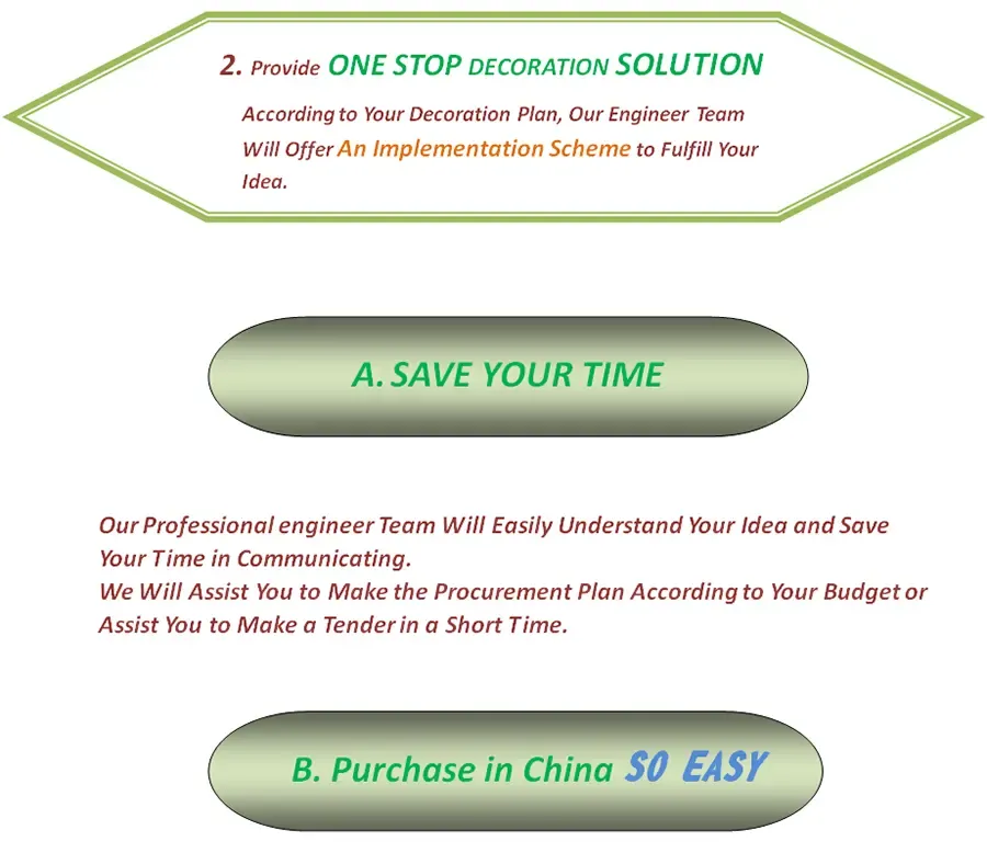 1.Building Exterior Wall and Interior Decoration Style Customization. Interior and Exterior Decoration Design. Professional Engineers Team will make an efficient solution according to Customer’s Tender or Request.