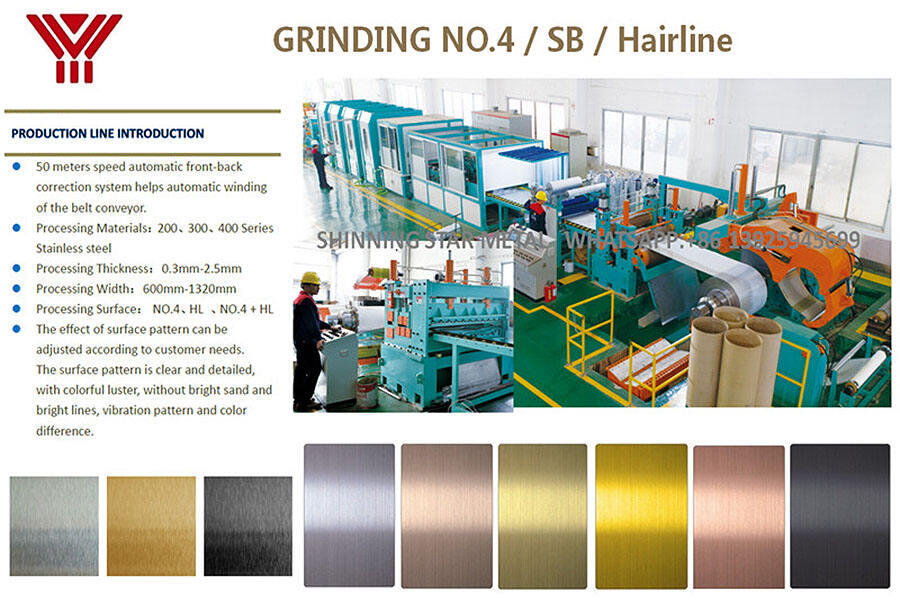 We are well equipped with Grinding Machines for Brushed Stainless Steel, Hairline Stainless Steel, SB Stainless Steel, Snowflake Stainless Steel, NO.4 Stainless Steel. Daily output is 500Mt. The texture is Grain #180/240/360/400. Welcome to send sample and do customization.